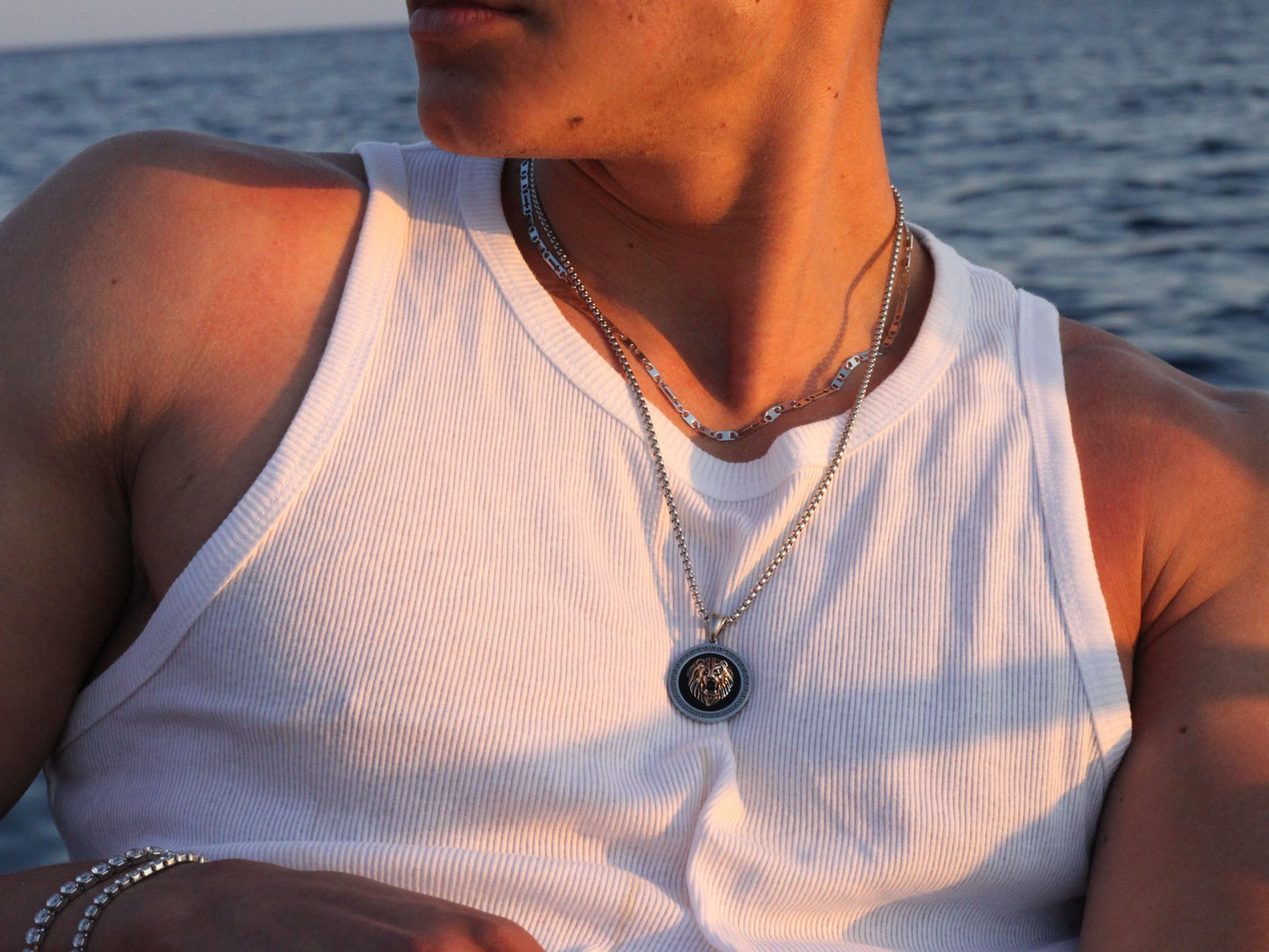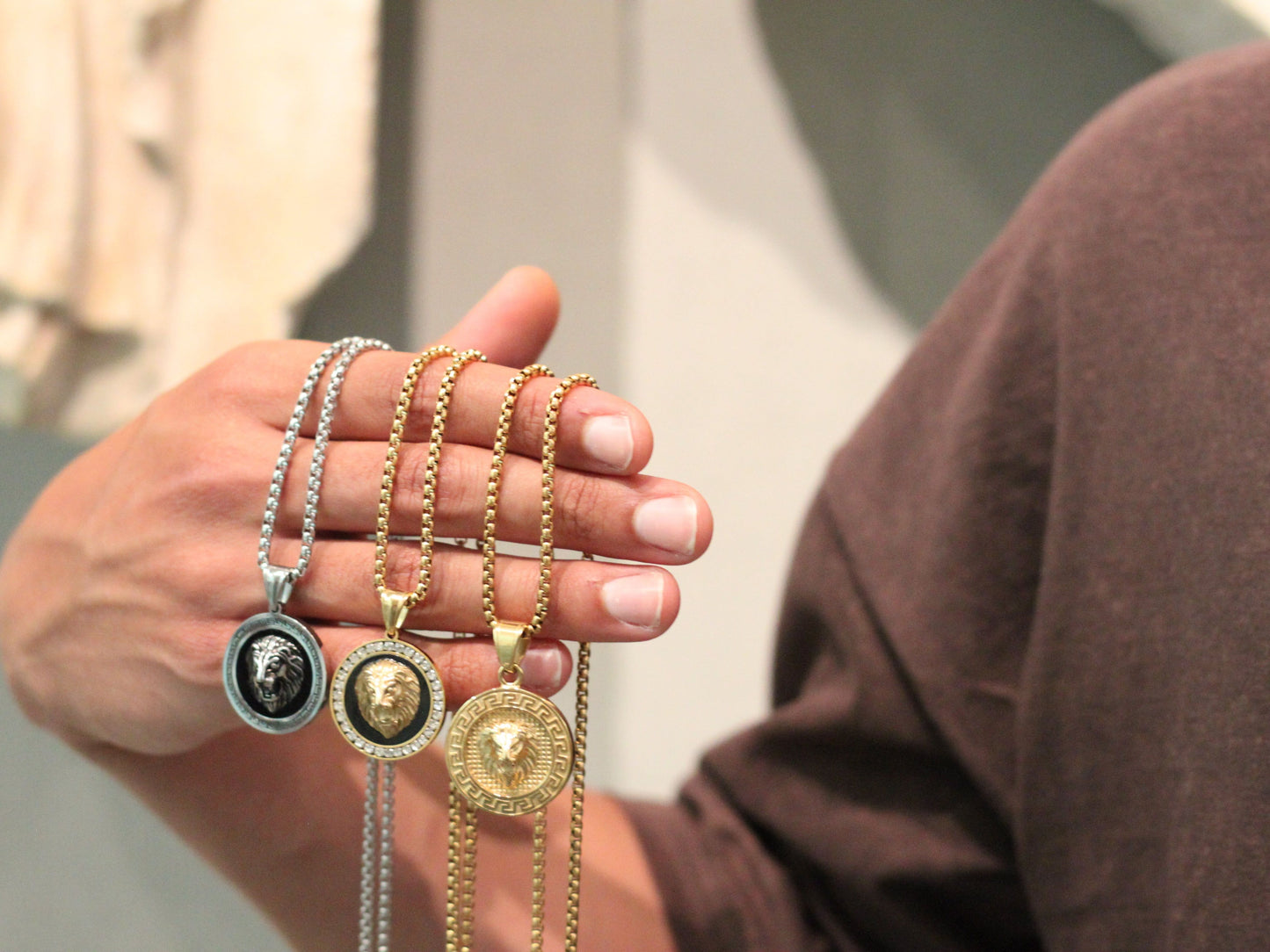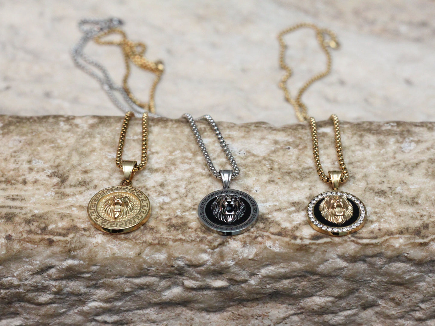 The Medusa's Lion Small Round pendant features intricate Medusa details that add a unique touch to its striking design. It comes with a matching rolo chain, making it a complete accessory for any outfit. This bold piece embodies strength and style, perfect for those looking to make a statement. Elevate your jewelry collection with this captivating pendant!