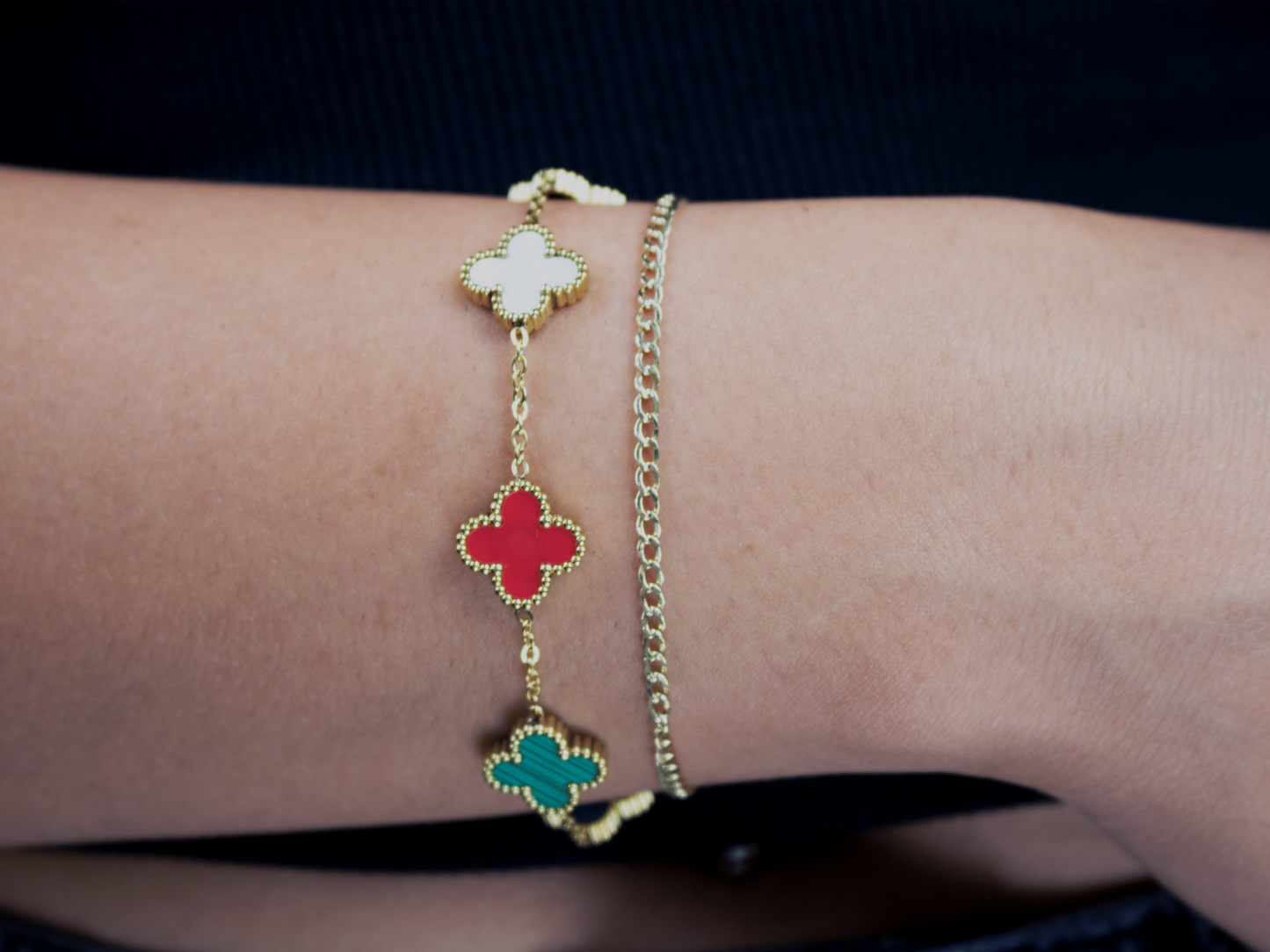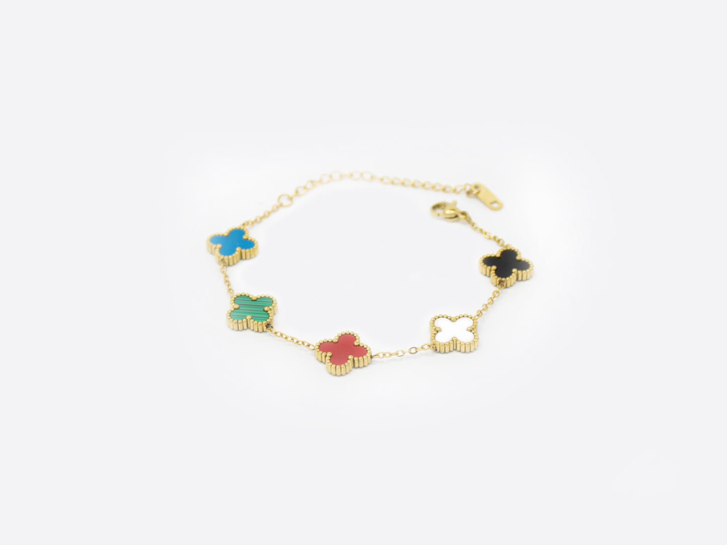 The Multi-Colored Four-Leaf Clover Bracelet is part of the Four Leaf collection, featuring vibrant colors that symbolize luck and positivity. This charming bracelet is designed to stand out, making it a perfect accessory for any outfit. There is also a matching necklace available, allowing you to create a complete and stylish look!